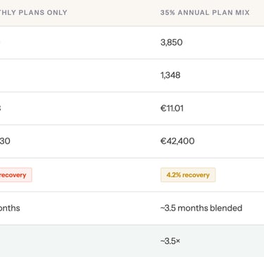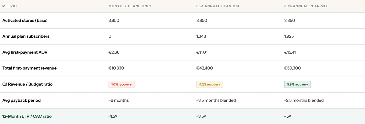 The highest-leverage action of the quarter: The €0.026/day checkout framing A/B test. Moving annual plan mix from 20% to 50% raises 12-month LTV/CAC from 1.5× to 5× — without changing a single channel or CAC. It's not a creative detail; it's a unit economics inflection point. This single test costs €4,000 to run and could be worth hundreds of thousands in first-year revenue.