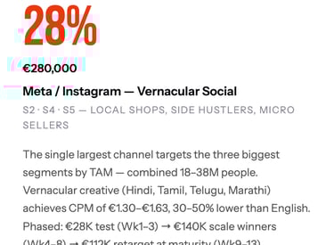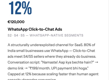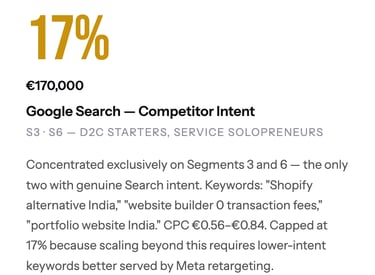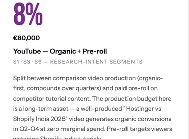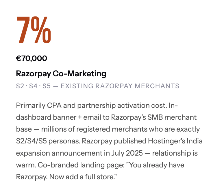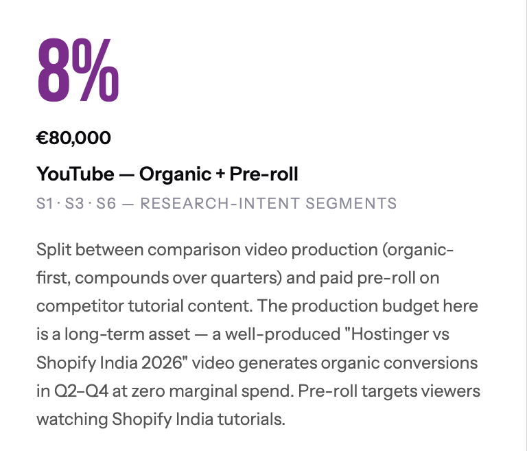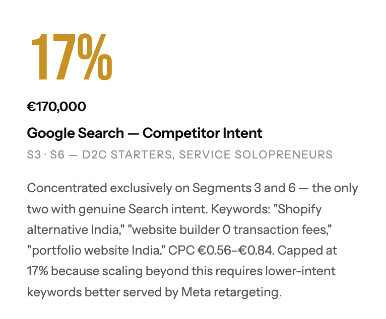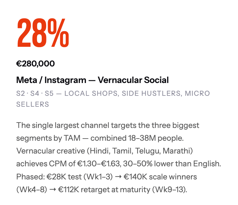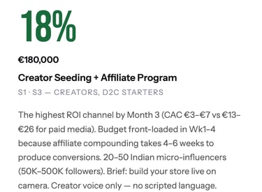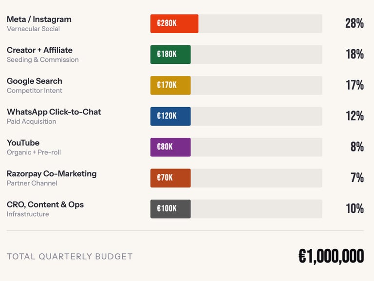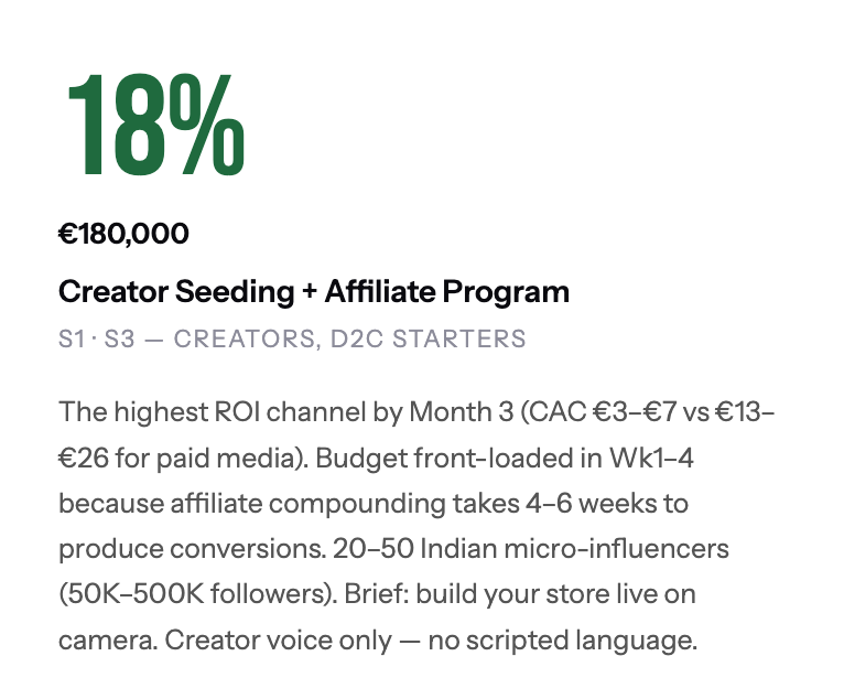 Each allocation is justified by the persona research from Part 1. Budget weight follows segment TAM size, channel CAC efficiency, and the 4–6 week compounding lag of creator and affiliate channels.