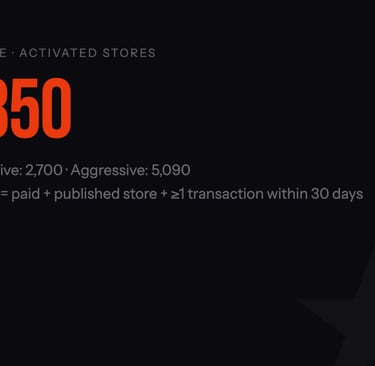 Total activated stores, blended CAC vs forecast, payback period, annual plan mix, LTV/CAC ratio by segment.