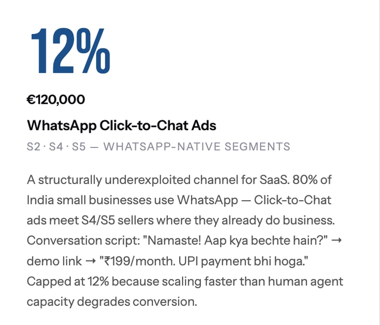 A phased, data-driven deployment across 6 channels and 3 operational lines — structured to acquire 3,500–5,000 activated Indian stores at a blended CAC of €13–20.